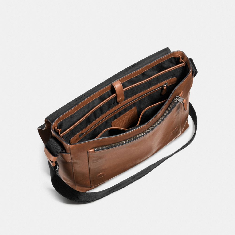 - The minimalist look of the Metropolitan Courier conceals an interior filled with functionality, including two zippered compartments, dedicated space for a laptop, and slip pockets to stow a phone, chargers, cables and other small essentials. Crafted in smooth, edge-painted leather, it comes finished with a durable nylon strap.